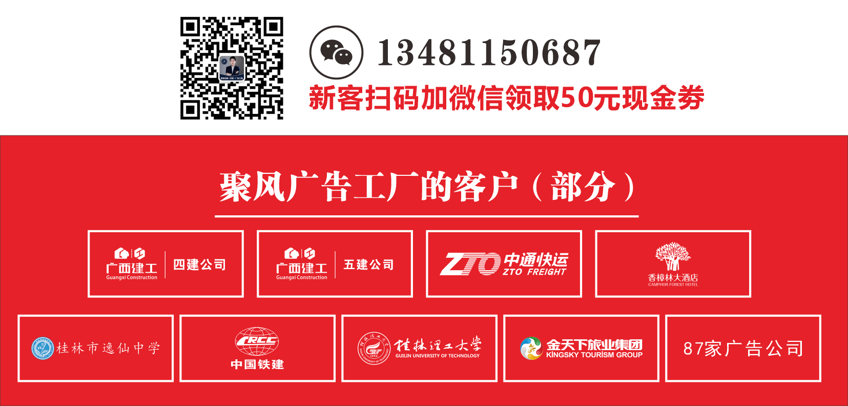 以上算是聚風廣告工廠的部分介紹,如果想了解更多,歡迎添加聚風廣告工廠微信;如果你正想找桂林廣告公司合作,也歡迎添加微信,相信合作后,您一定也會認可聚風廣告工廠是一家值得長期合作的桂林廣告公司的!