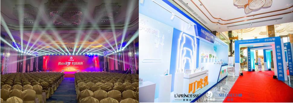 2)氛圍布置。包含:入口的道旗、簽到墻、地毯、展示架等。